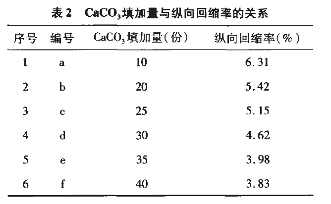 (2)配方中填料的填加量影響較大,以CaCO3的填加量作分析,隨CaCO3的填加量增加管材的縱向回縮率在減小,隨著CaCO3的填加量到一定值時(shí),CaCO3的填加量不再是影響管材縱向回縮率的主要因素。